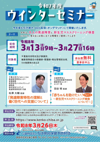 毎年、千葉県内の保健師、看護師、衛生管理担当者等の皆様、その他興味のある方を対象に、健康づくりを考える「ウインターセミナー」。 今年度も Web 配信で実施致します。 *チラシのダウ...