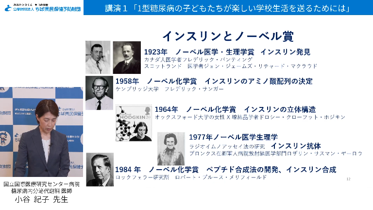 今年度は講演Ⅰとして「1型糖尿病の子どもたちが楽しい学校生活を送るためには」と題して、国立国際医療研究センター病院 糖尿病内分泌代謝科 医師 小谷 紀子先生に、1型糖尿病の子どもに対する学校での支援方法等についてご講演いただきました。ま