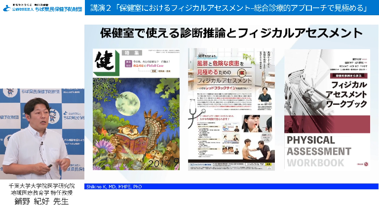 た、講演Ⅱでは「保健室におけるフィジカルアセスメント -総合診療的アプローチで見極める」と題して、千葉大学大学院医学研究院 地域医療教育学 特任教授 鋪野 紀好先生に、保健室でよく見かける疾患に対する緊急性の見極め方についてご講演いただきました。
