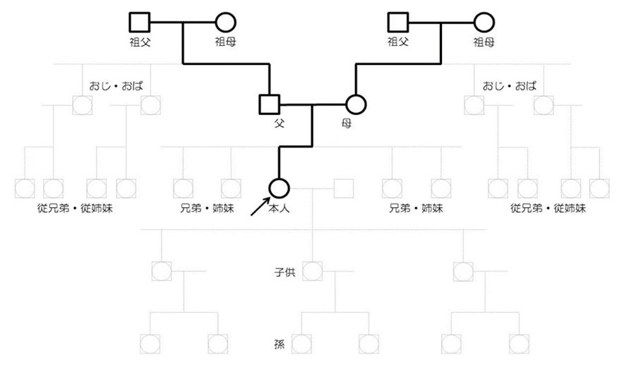 - 家系図/血縁の方の病気に関して詳しくお聞きして家系図を描くことは、その病気が遺伝性かどうかを判断するのに重要です