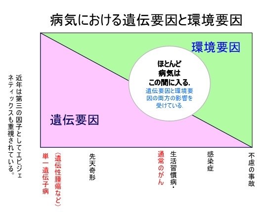 - 病気における遺伝要因と環境要因/多くの病気には遺伝要因と環境要因(喫煙、肥満など)の両方が関与します 「がん」の5%位は遺伝要因だけで発病すると考えられます遺伝的リスクを正しく理解すれば、本人やご家族のがん検診に役立てることができます